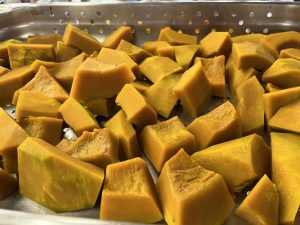 かぼちゃの皮と種を除いて、蒸してから牛乳と一緒にミキサーにかけ、なめらかにします。今日のかぼちゃは水分が少なくかたかったため、予定量の牛乳では水分が少なくて、ミキサーがなかなか回らず苦しみました。