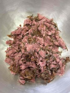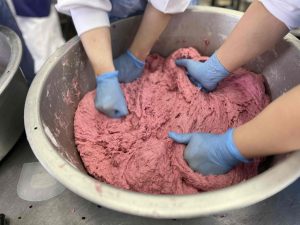 調理員さんがみんなでこねこねしてくれました。手作業なのですごく大変です。