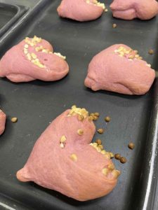 生地の真ん中にホワイトチョコチップを入れ包みます。これも手間のかかる作業でしたが頑張ってくれました。