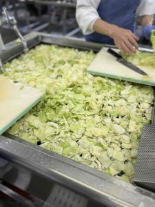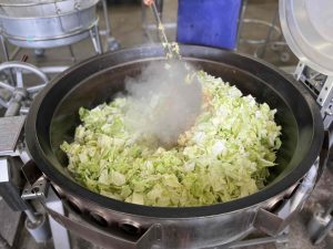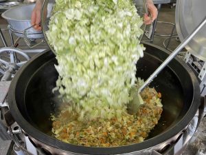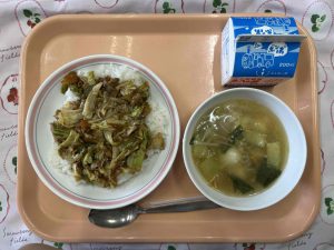 今日はキャベツを中学生一人分の体重ぐらい使いました!大きいザルに大盛り4杯分になりました。先にキャベツの芯を炒めて、最後にキャベツの柔らかい部分を炒めて歯ごたえを残して!!と細かい注文をたくさん出しましたが、調理員さんがちゃんと歯ごたえを残しつつ上手に仕上げてくれました(^^)/