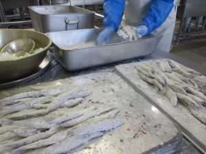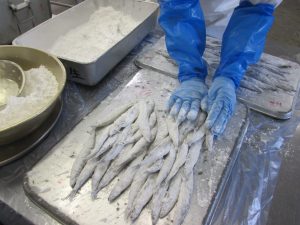 ししゃもに粉をまぶしてから油であげます。