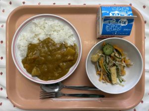 月曜日はなるべく配膳が簡単で子どもたちに人気の献立にしようと考えているのですが、今日はカレーでした(^o^)