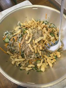サラダには、オーブンでカリッと焼いた油揚げとから煎りしたごまをトッピングしました。2つともカルシウムが摂れる食材です\(^o^)/