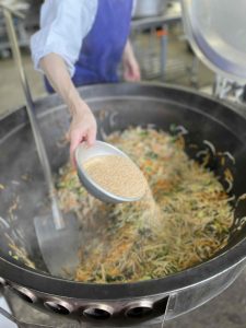 ごま和えを作っている様子。ごまは使う前に煎っておき、ごまの香りが感じられるようにしています。アレルギーの子用はフライパンで別に作っています。