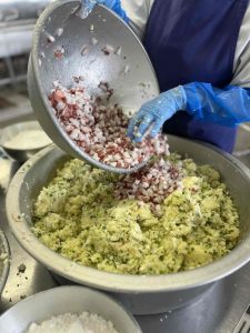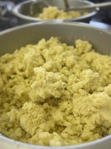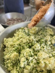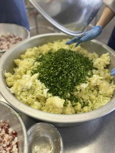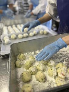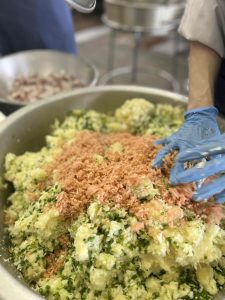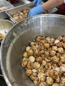 今日は高価なタコをどうしたら給食に使えるか?そして子どもたちがよろこんで食べてくれるかを考えて初めての「たこ焼きポテト」を作りました。蒸して潰したじゃがいもに、たこ焼きの具を入れて、丸めて揚げました。