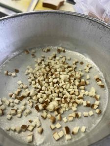 今日のサラダはクルトンも手作りでした。食パンを切ってオーブンで焼いて、調味料をちょちょっとからめて完成です。サラダには大量のキャベツを使いましたが、大人気でよく食べていました。