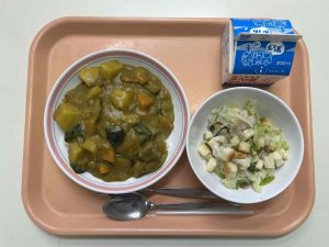 今日はかぼちゃ、なす、ピーマン、ズッキーニなど夏野菜をたくさん入れたカレーを作りました。朝から先生たちに「今日はカレーですね?」と何人も声をかけられました(笑)カレーのルーも小麦粉やカレー粉を合わせて作るため、朝から廊下にはいいにおいがしていました(*^_^*)