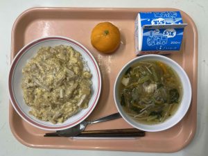 あぶたま丼は見た目はおしゃれな食べ物ではありませんが、味はとてもおいしので、人気があります!はじめはこの見た目に子どもたちは戸惑っていましたが、やり続けるほど人気が出てきた献立です!今日もおかわりしてくれる子がたくさんいました(*^_^*)1年生の先生にも美味しかったですと声をかけていただきました☆