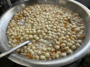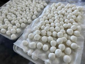アルファー化米に白玉粉を混ぜて団子をこねて、下茹でしてから汁に加えています。