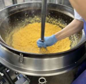 ビビンバを混ぜる向こう側で、大きなしゃもじが待ち伏せしています。これはごはんに混ぜる具がきれいに混ざるように、パートさんがサポートに回っていてくれる様子です。味が美味しいのはもちろん、見た目にもできる限りこだわっていい状態で届けたいのです(*^_^*)いつもわたしのこだわりを理解して心を配ってくれる調理員さんに感謝です♡