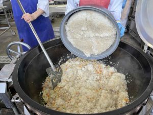 チャーハンは釜でごはんと具を混ぜ合わせています。今日は給食室のテストのようなものがあり、調理員さんはとても緊張していたようです。給食室は空気が重かったのですが、生徒がいつも通りよく食べてくれる姿を見て、やっとほっとしました。明日からまた頑張っていきます☆