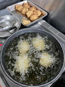 今日は3年生からのリクエストで「たこ揚げ」を作りました。アレルギーの子の分を揚げている様子。滝のような汗をかきました。でも生徒がよく食べてくれていて頑張った甲斐がありました!!