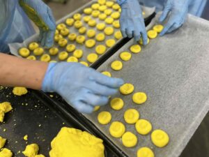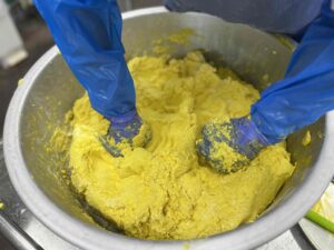 蒸して潰したかぼちゃと白玉粉を練り合わせてだんごを作ります。手袋がやぶけないように慎重に作業します。お団子は調理員さんが1つ1つ手作業で丸めてくれます。一人3個ずつなので約1500個丸めました。