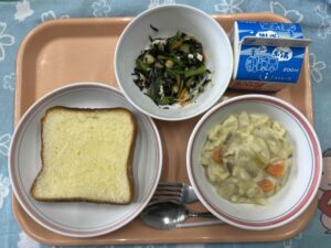 今日は久し振りの「マカロニのクリーム煮」の登場でした。見本を見に来た子や、教室で配膳を待つ子たちからも「おいしそう(*^_^*)」とたくさん言ってもらえました。