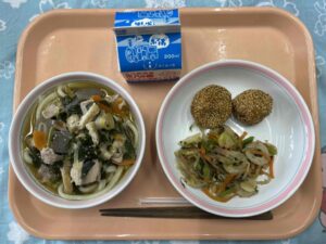 今日はかわいいごま団子のイラストです。学級閉鎖で肉うどんが食べられなかったクラスの子が「肉うどん食べたかった-」とお手紙をくれていました(^o^)また作るので、明日元気に来てね。待ってます。