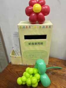 2年生が一生懸命お手紙を書いてくれるので、意見箱を可愛らしく飾りました。だんだんしぼんでしまいますが、シャインマスカットは先生方にも好評でした!!テスト休み中に試作もしました。本番はもう少し上手にできると思います!!