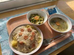 今日は「小金井桜」が国の文化財指定を受けた記念日です。私たち小金井市の栄養士は「小金井桜」を未来につなげるために、食の面からこどもたちにアプローチをしようと「小金井桜献立」に挑戦しています。今日は初めてのスパゲティに挑戦するため、家で練習をたくさんしました。家ではもっと鮮やかなピンク色に仕上がったので、あらかじめ子どもたちには「驚かないでね!」「味は大丈夫だから!!」と言っておいたのですが、当日は時間の経過とともにツナマヨ程度の薄いピンクになってしまいました(-_-)良いのか悪いのか子どもたちはよく食べてくれたようで、廊下で会うと女の子たちが「今日のスパゲティめっちゃおいしかった!!」とたくさん声をかけてくれました。