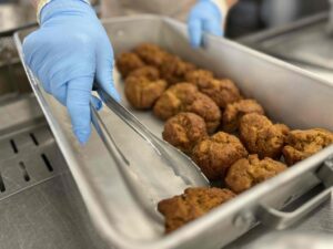 今日のデザートは手作りのサータアンダギーです。このレシピは「たまご」を使っていません。たまごにアレルギーのある子も同じものが食べられるデザートを作りたいと考え、今年初めて挑戦しました。南中のこどもたちにとてもよろこんでもらえたので、その後、他の学校の栄養士さんともレシピを共有しました。好評だったよ!と連絡をもらいうれしくなりました\(^o^)/新しいことに挑戦するのはとても勇気がいります。うまくできなかったら子どもたちや先生たちに申し訳ないので安全にできる献立にしたりと守りに入りがちですが、新しい献立を楽しみにしていてくれる子もたくさんいるので、努力をこつこつとして、挑戦を続けたいと思います。