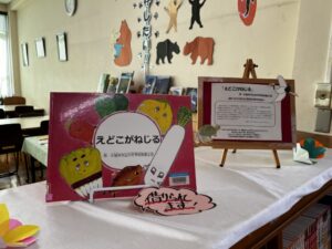 南中の図書室に食育絵本「えどこがねじる」を特別仕様で置いていただいています。たくさんの子が手に取ってその場で読んでくれていると司書の先生から聞きました。図書室にもお人形を置いてもらえるように作成しようと考えています。多くの人に愛される絵本になりますように。