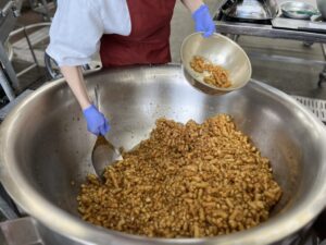 人気の「いかの中華ソース」を配缶する調理員さんの様子。中華風の料理が好きな先生が今回も「美味しかったです!」と声をかけてくださいました(゚∀゚)いつもうれしくてありがたいなと感じています。
