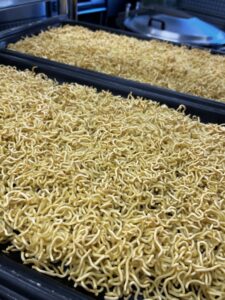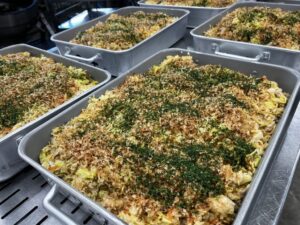 麺は短く切って、オーブンでカリッとなるぐらいまで焼きます。麺が固くなった状態で調味料や野菜、ごはんと混ぜ合わせると、食べるときにはちょうどよい歯ごたえになります。子どもたちには伝わらない部分ですが、調理員さんの細やかな調理作業により、味だけでなく食感もよく仕上がりました。