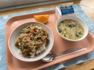今日はプルコギ丼が美味しい!と3年生から「👍️」のサインをもらいました(*^^*)味見をした時はしょうがの味がいつもより強い気がして心配でしたが、後から食べたら落ち着いた味になっていて子どもたちにも好評でよかったです。
