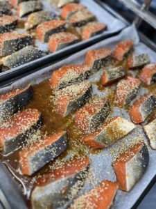肉厚で美味しそうなさけに下味をつけてごまをふり焼いていきます。