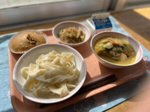 今日は2年生のリクエストで「ほうとう」を作りました。本当は煮込んでこそ「ほうとう」かなと思うのですが、給食だと作り終わってから子どもたちが実際に食べ始めるまでに時間が空いてしまうので、麺が伸びてしまうことを考慮して、麺と汁は別で出しました。この形での提供をみんなはどう思うか心配でしたが、子どもから「◯◯先生が、つけ麺スタイル嬉しいって言ってたよ」と教えてもらいました。子どもの優しさにほっとした瞬間でした(*^^*)ヤサシイナァ