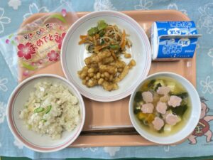 令和7年度の給食は明日が最終日ですが、卒業式前日で忙しいので今日、卒業や進級を控えたみんなに、応援やお祝いの気持ちを込めて「たい飯」を作りました。また、お赤飯は苦手な生徒が多いと先生から聞いていたので「たい飯」にすることで喜んで食べて欲しいなという気持ちもありました。